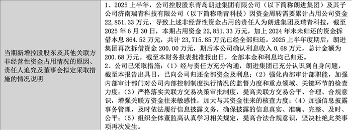 半年报的详细数据显示,公司的控股股东青岛朗进集团及其子公司济南瑞青科技,在2025年上半年因资金周转需要,累计占用了公司资金2.29亿元。加上2024年末未归还的864.52万元,占款总额高达2.37亿元。尽管朗进科技在报告中强调,截至2025年6月30日,上述占款已全部归还,但报告同时揭示,在此之后朗进集团再次拆借了200万元,直至财报发布前才最终清偿。