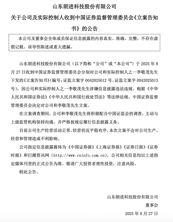 8月27日晚配资谈谈网论坛,山东朗进科技(300594.SZ)前脚刚披露该公司及实际控制人之一李敬茂被证监会立案调查的公告,随即发布了2025年上半年净利润成功扭亏为盈的喜讯。两则信息同时出现,让市场颇感错愕。