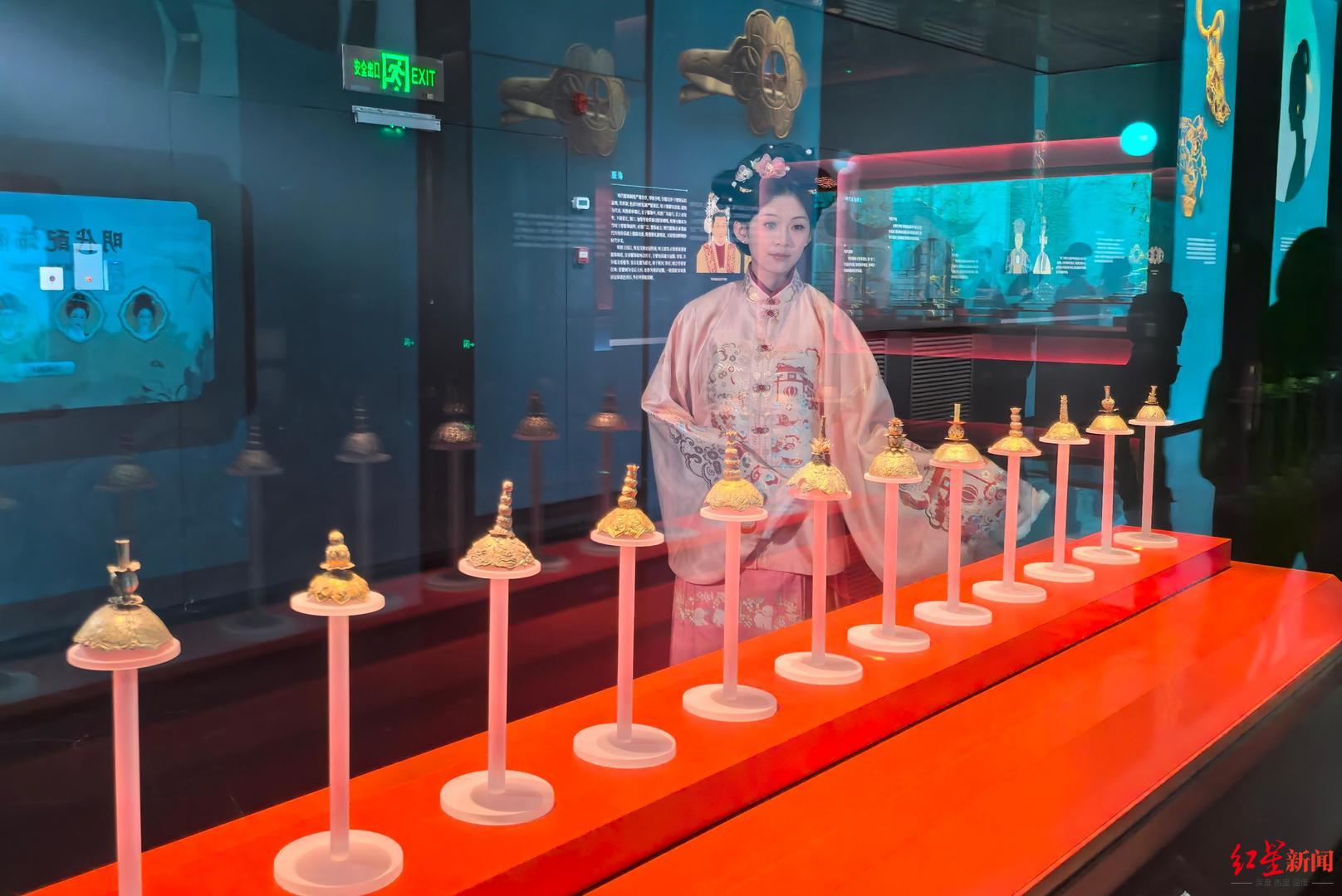 循着从江底“唤醒”的文物,第二展厅将解开沉银背后的历史谜题。讲解员通过荣王府金册、蜀世子宝金印、长沙府岁供王府金锭等宗府遗珍,解读明代藩王制度与财政危机;以明代帽顶、金银带銙、葫芦形金耳环等饰品,展现明代工艺之美与社会生活。