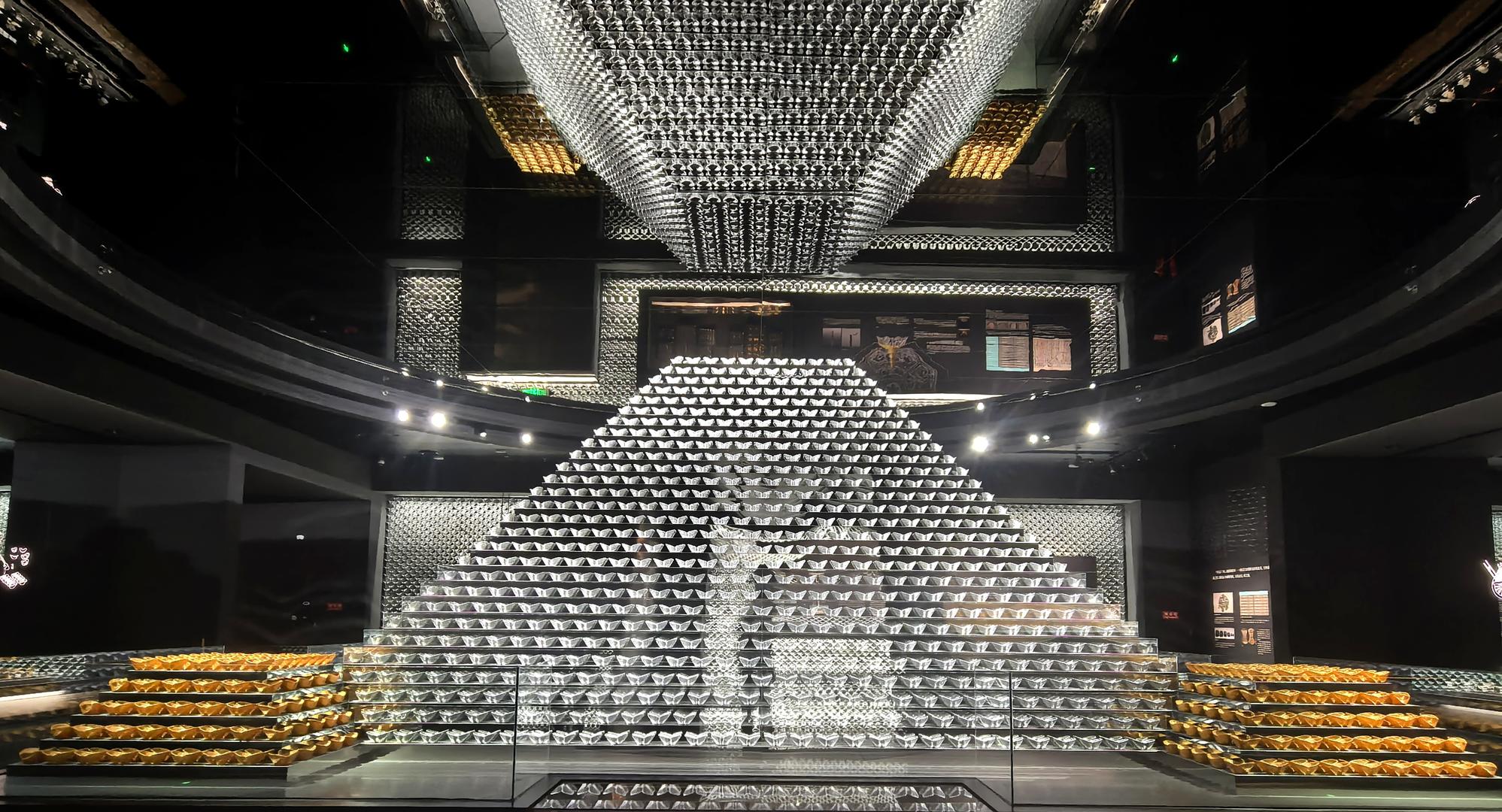 在展馆内,还有多处极具视觉冲击力的打卡点:一块3米高的巨大“银锭”工艺品,泛着冷峻的金属光泽,还原了明代百两银锭的震撼体量;一堵由数百枚银锭镶嵌而成的“银锭山”,在灯光下银光熠熠,构成一座金字塔般的“财富之山”,吸引了众人拍照留念。