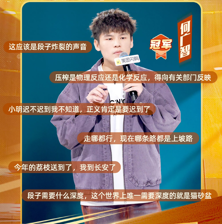 得知何广智夺冠后,同为前几季的“大王”、好友呼兰在采访中落泪到掩面抽泣。因为何广智代表着那批坚守脱口秀舞台的“老实人”,呼兰说:“有时在生活里可能也是‘信心不足’,这时候看到一个体面的好人活得特别好,就会给你信心,你就会觉得,我还是要做这样的人。”而用何广智的自喻更绝:“尽管送荔枝的路坎坷,我也终会抵达自己的长安。”