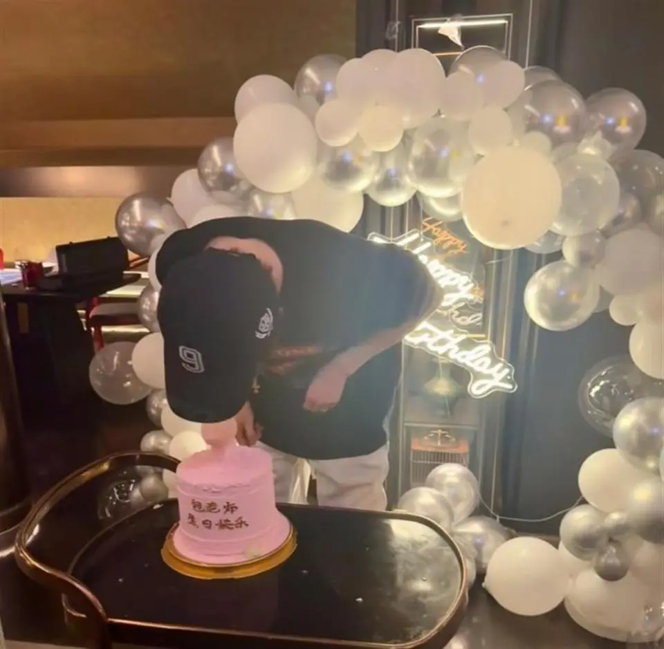 这次生日趴是在家里办的,没有整得多奢华,但氛围感拉满。 客厅用银色和白色的气球搭了拱门,还有个发光的英文生日牌 。 最有意思的是那个蛋糕,粉粉嫩嫩的,上面还蹲着一只小兔子,写着“包老师生日快乐” 。 付辛博那天戴着大金表和项链,无名指上的婚戒明晃晃的,头上扣着生日帽,下巴尖得能锄地了,估计是最近又进组拍戏,为了角色在瘦身 。