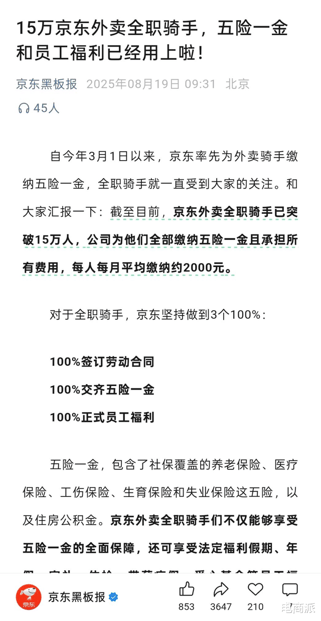 日前,京东发布消息称,京东外卖全职骑手已突破15万人,公司已全部为他们缴纳五险一金且承担所有费用。