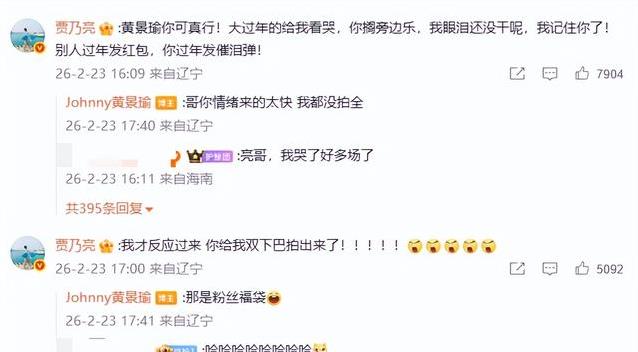 贾乃亮追剧追到哭,视频被黄景瑜发到网上。贾乃亮还开玩笑说自己双下巴都出来了。黄景瑜马上回了一句粉丝福袋,瞬间把气氛拉回来。高情商在这时候显露无遗,既化解了尴尬,又让人觉得他接地气。